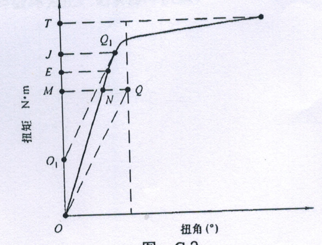根据记录绘制出下图所示的扭矩和扭角关系曲线图,在关系曲线图上得出的约翰逊弹性极限扭矩J和更小静扭破坏扭矩E和更大破坏扭矩T。